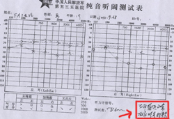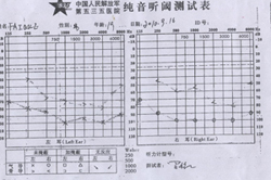 The left examination result was done on September 16, 2010 at No.535 Army Hospital, he was definitely diagnosed as severe binaural neural hearing loss.